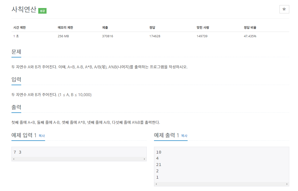 백준 10869 - 사칙연산 (JAVA) 본문