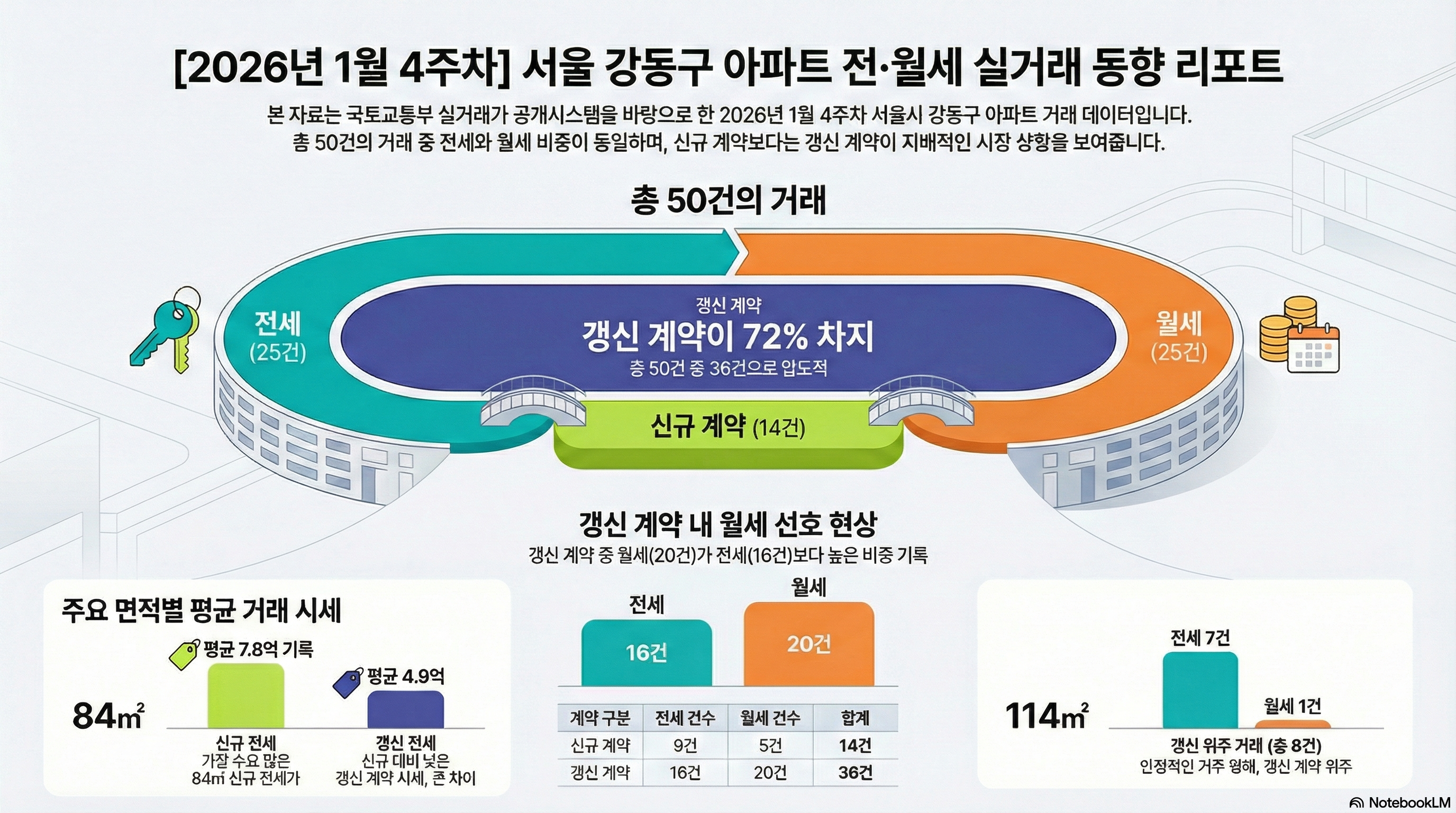 1월 4주차 전체 거래 50건 중 신규 계약은 14건(28%), 갱신 계약은 36건(72%)을 차지했습니다.
