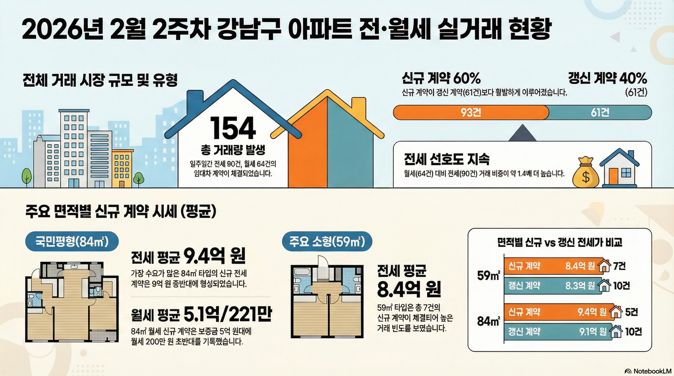 이번 주 강남구에서 집계된 총 154건의 거래를 분석해 보면, 시장의 역동성과 정체성이 동시에 관찰됩니다. 주목할 점은 신규 계약(93건)과 갱신 계약(61건)의 비율입니다.