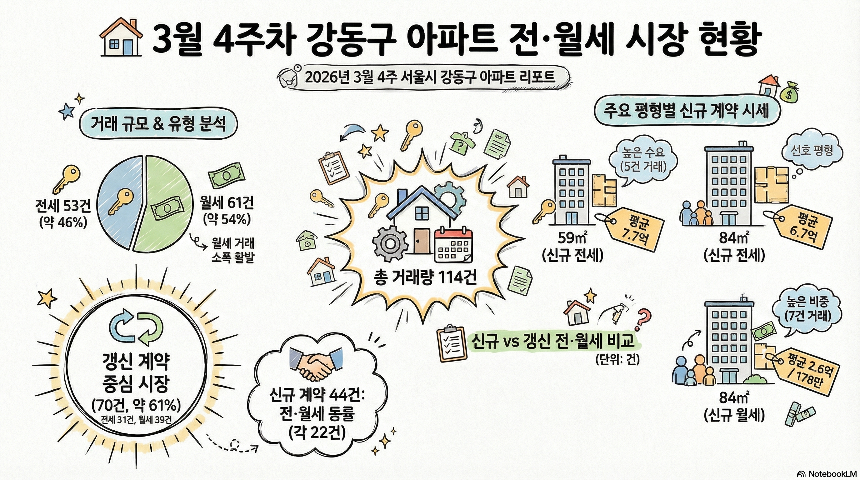 시장의 불확실성과 천정부지로 치솟은 신규 계약가는 세입자들을 기존 주거지에 묶어두는 ‘안주(Settling)’ 현상을 심화시키고 있습니다. 이번 주 집계된 총 114건의 거래 중 갱신 계약은 70건으로, 신규 계약(44건)을 압도적인 수치로 앞질렀습니다.